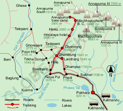 Transferred by air or private transport for your 6 -hour drive to Pokhara, a beautiful town set on the banks of the Phewa Lake. It is smaller and much less hectic than Kathmandu and is the perfect starting point for our trek. Your first day in Pokhara can be spent just relaxing or you may enjoy a visit to the Tibetan Refugee Camp and Devi Falls. The remainder of the time is yours to enjoy either doing last minute shopping for the trek or packing your kitty bag for the following day's departure. The following morning you will begin your trek north of the Himalayas. You will climb gradually along the ridges that are the foothills of the Annapurna. Remember, however, that you are in the Himalayas and that 95 percent of the country is hilly and criss-crossed by numerous trails. There is very little flat land. If you take it slowly and walk at an even pace you should not experience any problems. You will pass through many villages where you will have ample time to take photographs and chat with the local people. Language is not a big problem as many of the local people speak English, your Guide will be happy to translate for you. There are many different ethnic groups along the trail, but the major people in this area are the Gurungs. Together with the Magar and Chhetri people, the Gurungs are famous as soldiers in the British Army, better known as Gurkhas. Along the trail the views of Machhapuchhre and the Annapurnas are magnificent. The various trails from which we can choose lead us towards such Himalayan giants as Dhaulagiri (8167m), Lamjung, Annapurna II, and Machhapuchhre (6993m). Climbing higher, the winding trail passes through magnificent forests of oak and rhododendron that line the southern foothills of the Himalaya. The terrain varies from sub-tropical valleys with banana trees and rice paddies to high ridges clad in thick rhododendron forest. In January and February these may well be covered in snow, while during March and April they will be a blaze of red rhododendron flowers.