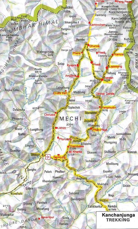 Kanchanjunga is the second highest mountain of Nepal with 8586 mtrs height. It’s a virgin area for trekkers & natural lovers. Its lies in the extreme east of Nepal & to the north-east of Sikkim & Darjeeling [India].This area is extremely suitable in spring with blooming rhododendron & varieties of other mountain flowers with super views of mountain ranges like Kanchanjunga , Janu , Nepal peak ,Khabrudome, Rathong [Makalu &Everest from gufa pokhari] &other ranges. Kanchanjunga sector is a bit tougher area than others & the trekker’s are advised to trek in easier trail before-hand. The weather in summer is full of monsoon rain and winters are cold. On the way we come across different settlements with varied cultures, different vegetation’s, varieties of wild animals and bird species. After four days trekking we do not find good villagers for marketing the necessaries. So, trekking is advised to be fully equipped on leaving for trek. There are two ways of approaches to this sector. Firstly, fly from Kathmandu to Suketar & back same way. Secondly, drive to Basantpur end in Kabeli khola back to Kathmandu by local bus or reserve van.